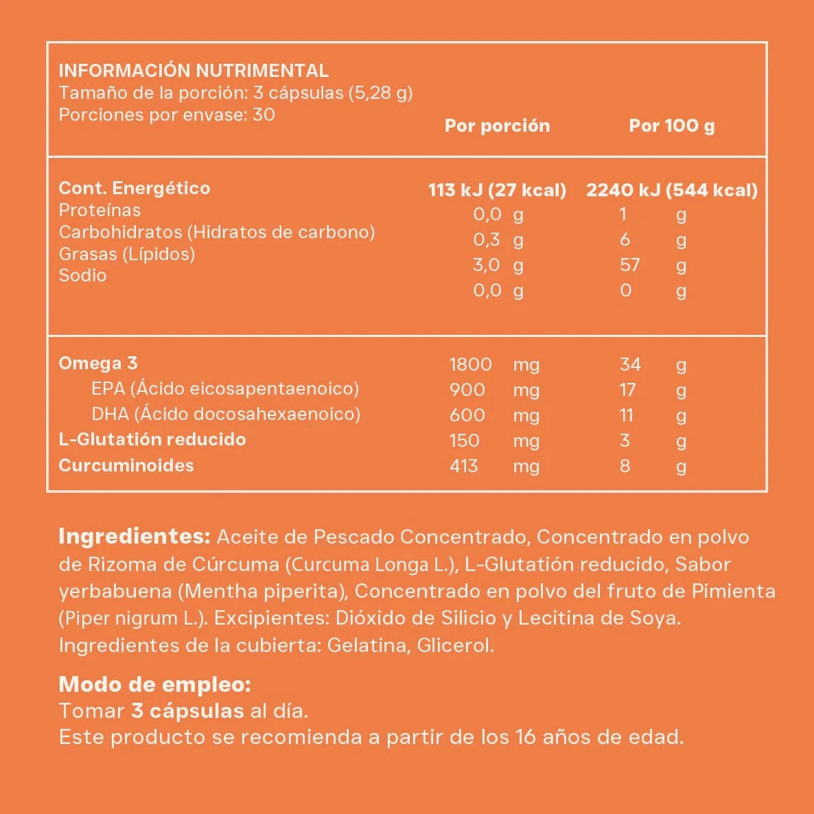 Aceite de Pescado Concentrado, Concentrado en polvo de Rizoma de Cúrcuma (Curcuma Longa L.), L-Glutatión reducido, Sabor yerbabuena (Mentha piperita), Concentrado en polvo del fruto de Pimienta (Piper nigrum L.), Excipientes: Dióxido de Silicio y Lecitina de Soya, Ingredientes de la cubierta: Gelatina, Glicerol.