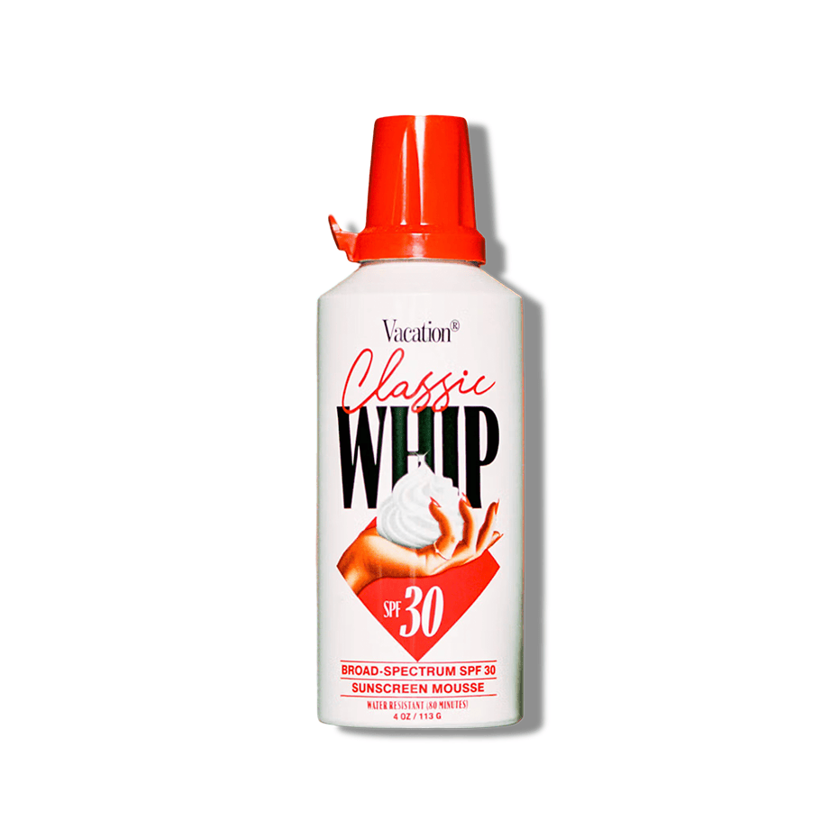 QUÉ ES: Vacation Classic Whip SPF 30 Sunscreen Mousse es un protector solar "más liviano que el aire" hecho con propulsores ecológicos y un auténtico actuador de "válvula de inclinación" que produce montañas de espuma perfectas en forma de estrella.