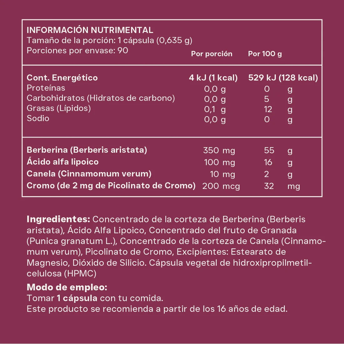 Cada cápsula contiene 350 mg de berberina, junto con ácido alfa lipoico, cromo y canela, seleccionados cuidadosamente por sus características naturales.