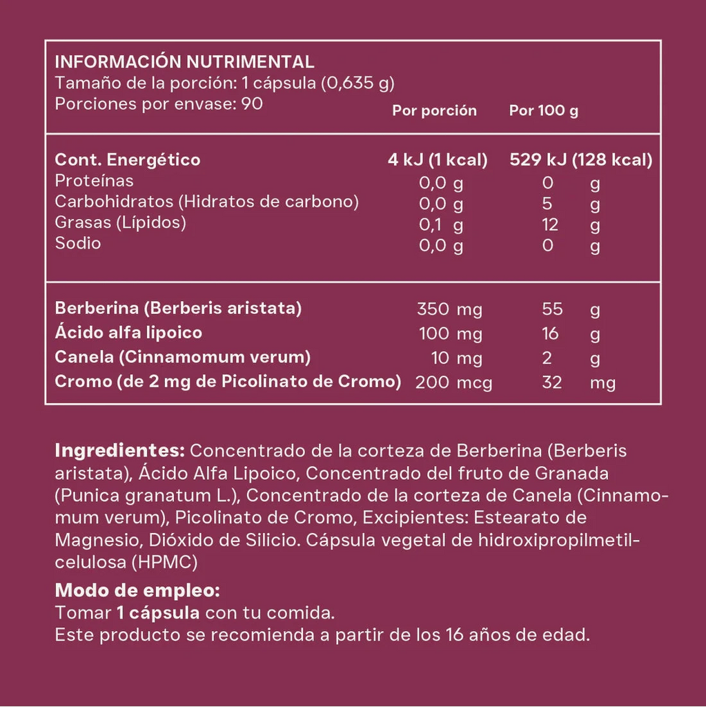 Concentrado de la corteza de Berberina (Berberis aristata), Ácido Alfa Lipoico, Concentrado del fruto de Granada (Punica granatum L.), Concentrado de la corteza de Canela (Cinnamomum verum), Picolinato de Cromo, Excipientes: Estearato de Magnesio, Dióxido de Silicio., Cápsula vegetal de hidroxipropilmetilcelulosa (HPMC).